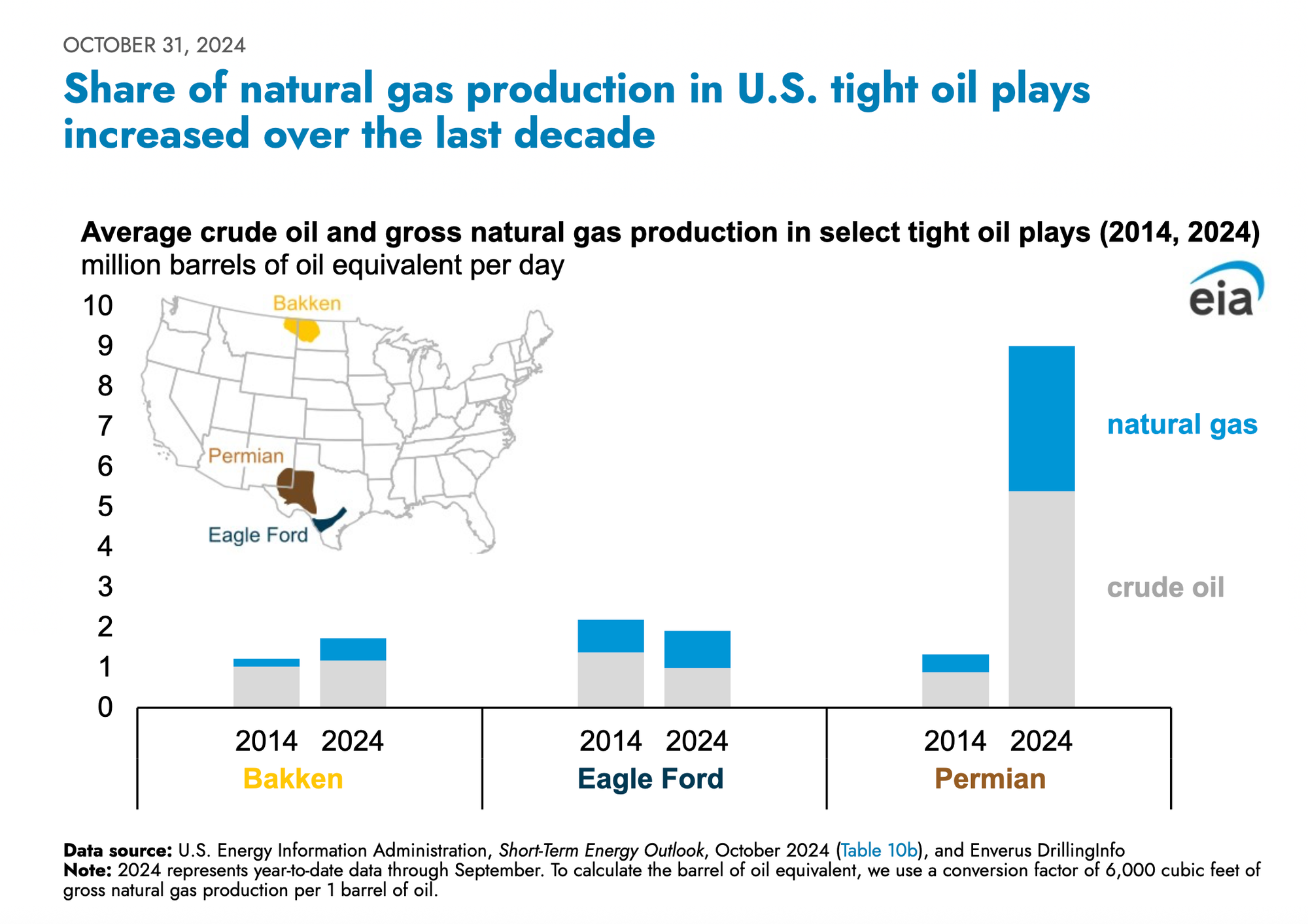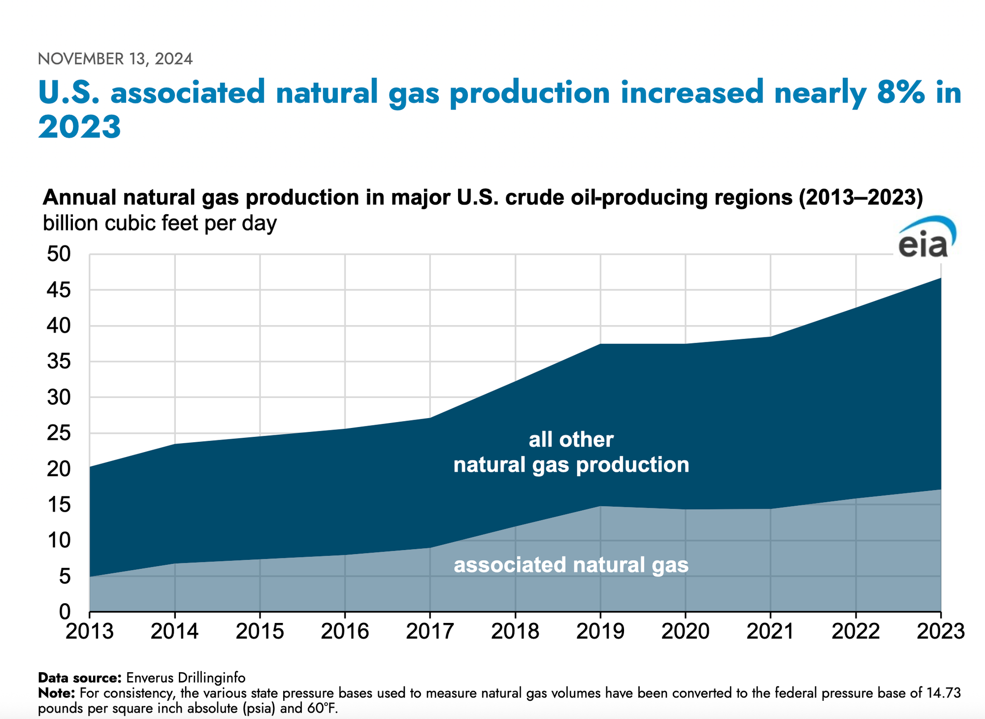 The fracking boom drove both crude oil and gas production but it also is creating a lot of associated gas, which is gas produced from oil production. This relationship means that the future of U.S. gas is dependent on the future of oil production and that associated gas, which the EIA says was over 36% of total gas production in the U.S. in 2023.