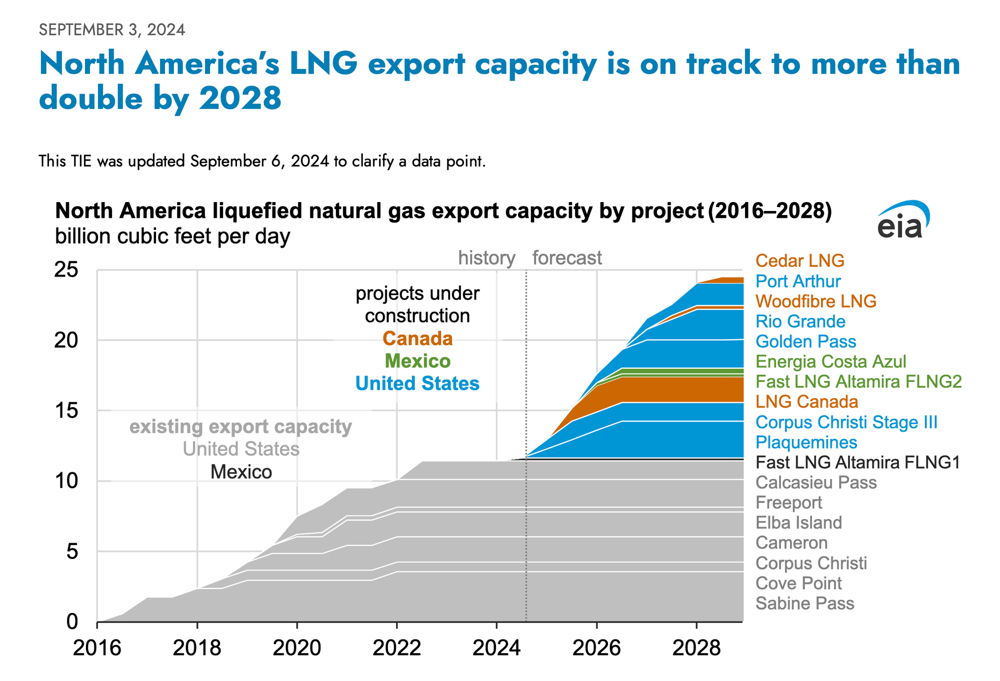 “The United States is the biggest producer of natural gas in the world and recently became the largest exporter of LNG. The industry is scrambling to build LNG (liquefied natural gas) export terminals as fast as permitting and funding will allow.