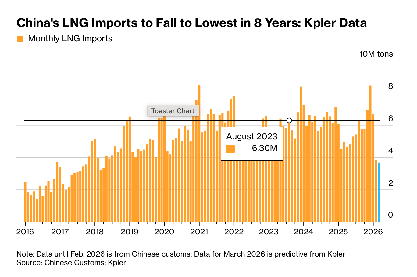 “Per Kpler data, China’s LNG imports this month will come in at 3.38 million tons. This would be the lowest since April 2018 and a palpable decline from February 2025, when imports of LNG clocked in at 4.47 million tons.”