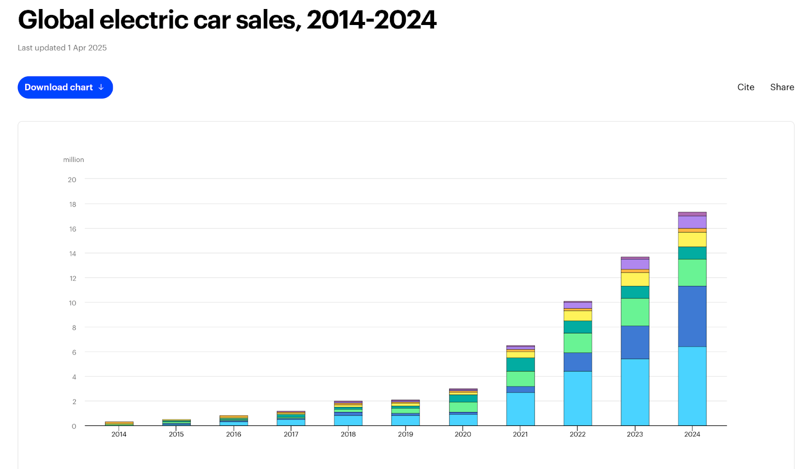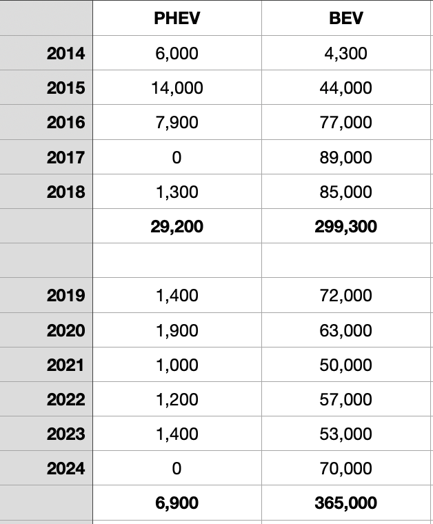Here is a chart of the number of electric cars sold by year (not all EVs).