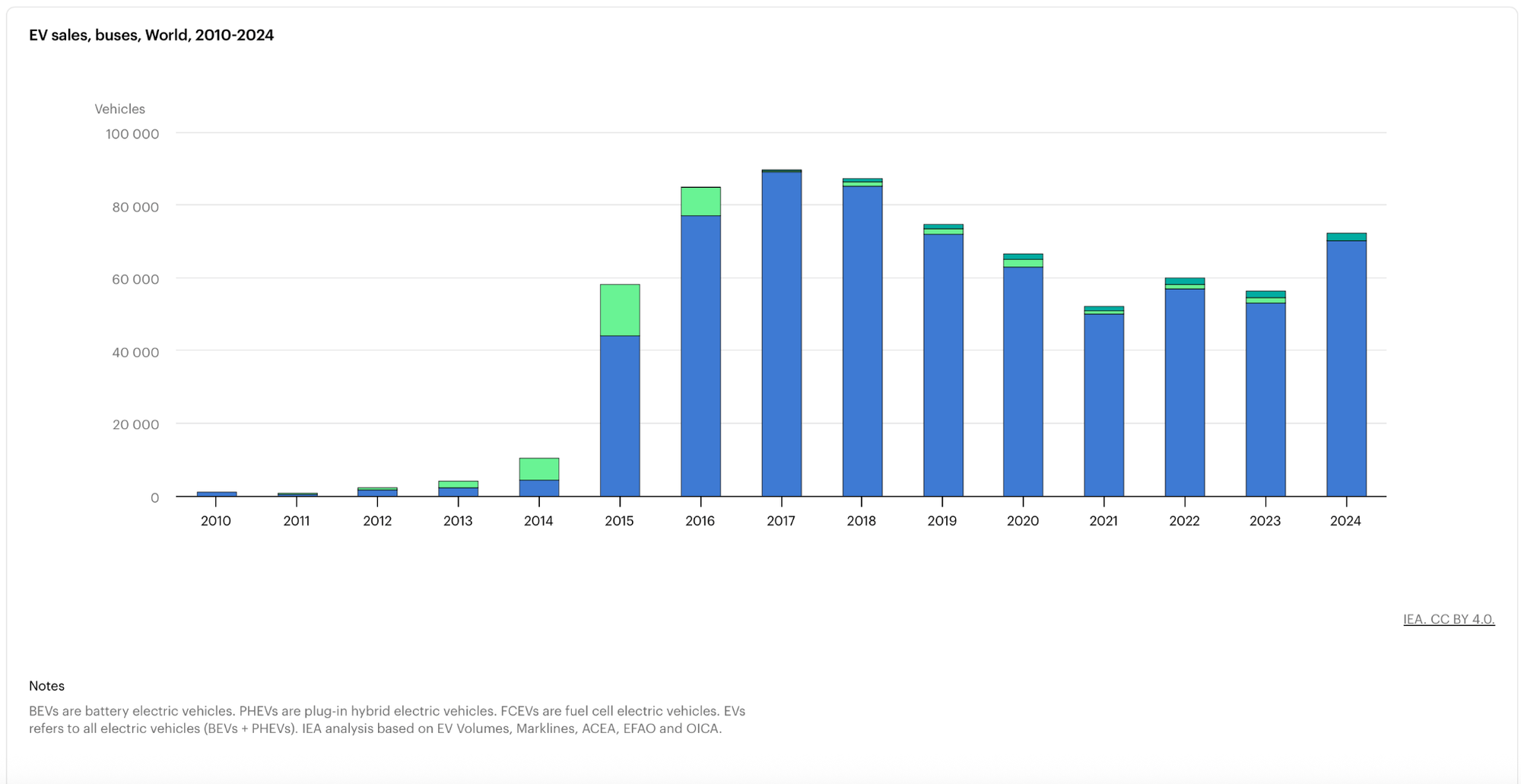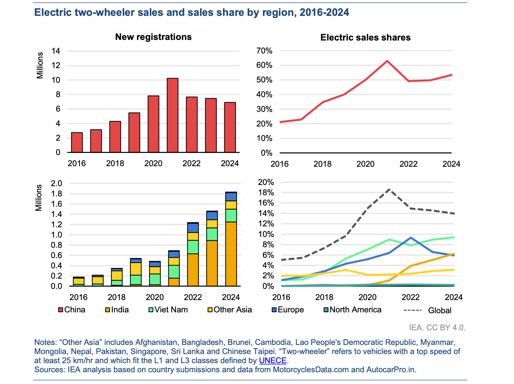 Now with the stunning rise of 2-3 wheel vehicles driving early demand destruction it is reasonable to ask why that isn’t continuing. Did we electrify the world’s fleet of 2-3 wheelers already? Not quite. From the IEA: “Two- and three-wheelers (2/3Ws) remained the most electrified road transport segment in 2024, with more than 9% of the global fleet now electric.”