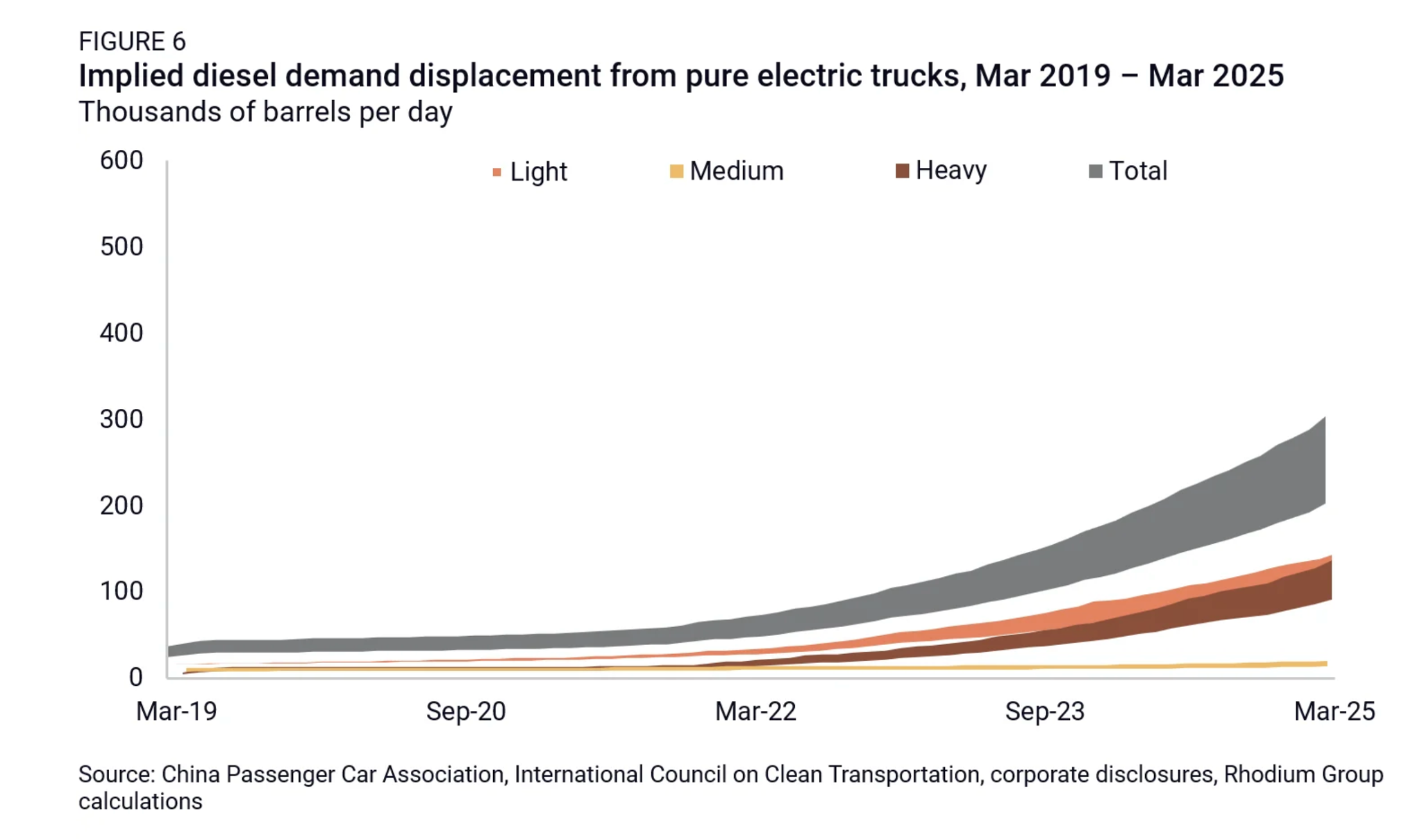 “....the ongoing electrification of China’s vehicle fleet, especially in trucking, suggests long-term headwinds to diesel and gasoline demand. We estimate the total electric vehicle fleet is already displacing over 1 million barrels per day in implied oil demand—equivalent to roughly the daily oil production of Oman. That level is likely to rise by around 600,000 barrels per day over the next 12 months.”