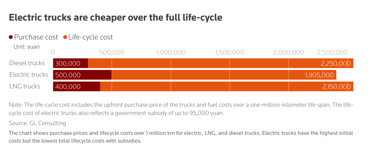 The rapid transition to clean energy and electric transportation is about money. And electric trucks will make money for the trucking industry. Trying to compete using diesel will be a disadvantage. Remember how China went all in on electric buses. If the same happens for their trucking industry it will be significant for global oil demand. So how is that going? From Reuters: "The surge in electric heavy trucks was a surprise and has become a new factor accelerating China’s oil consumption to peak, most likely this year," said Ye Lin, vice president at Rystad Energy, who had previously expected a 2026 peak.