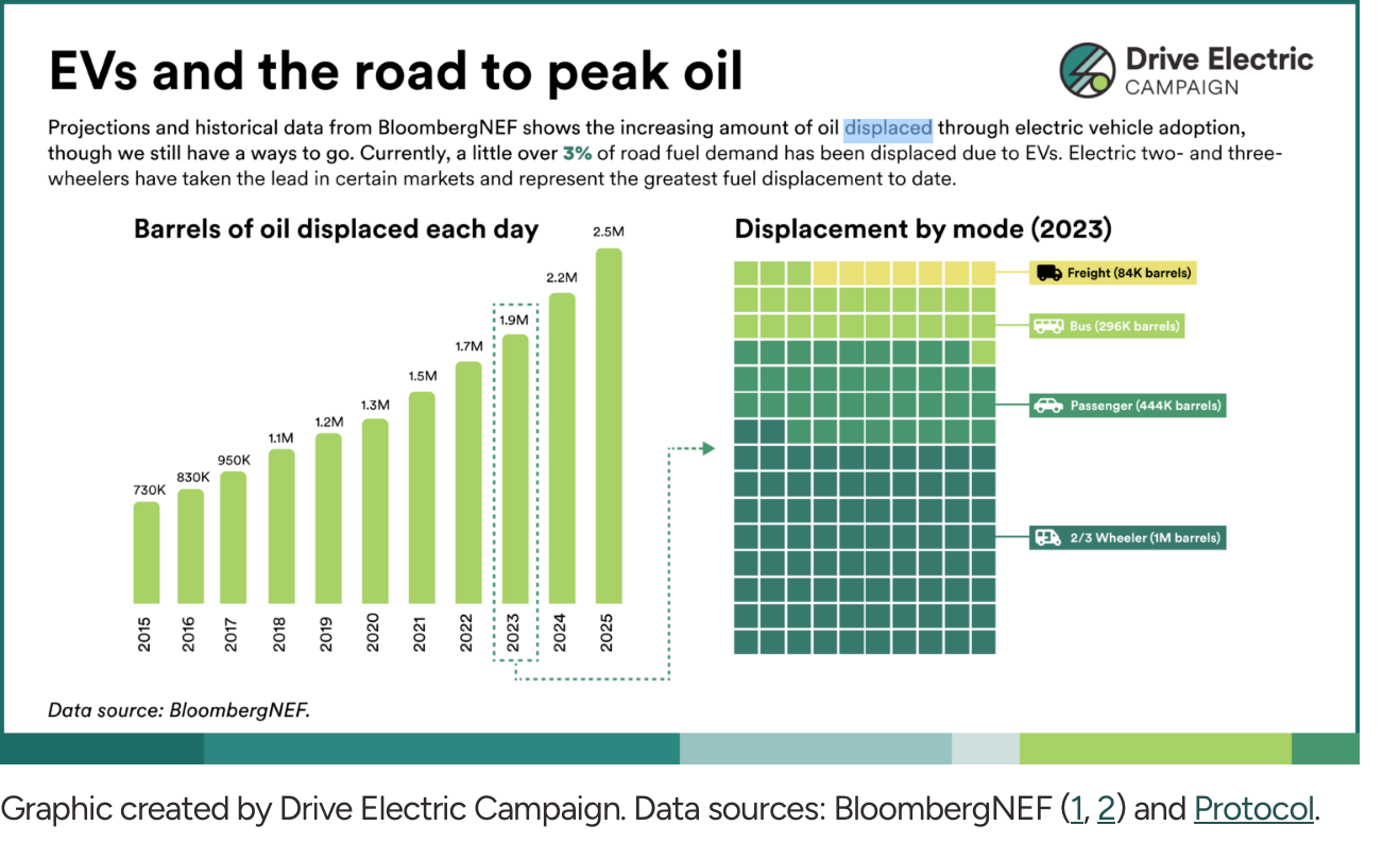 In an August article about the rise of EVs it notes that the International Energy Administration (IEA) is expecting EVs to contribute 5 million barrels per day of oil demand destruction by 2030. This echoes the statistic I see more widely cited which is from BNEF and is referenced in this Inside EV’s article: