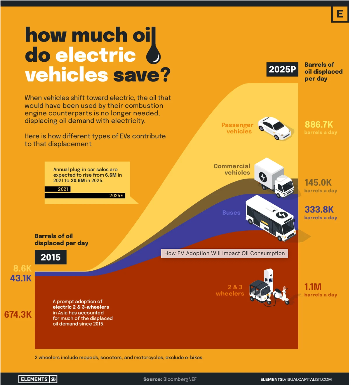“According to BNEF’s economic transition scenario, the first million daily barrels of road fuel displacement happened in 2018 thanks to early adoption of EVs” which they say puts the world on a path where by the end of the decade, “EVs are expected to displace more than five million barrels of road fuel per day.”