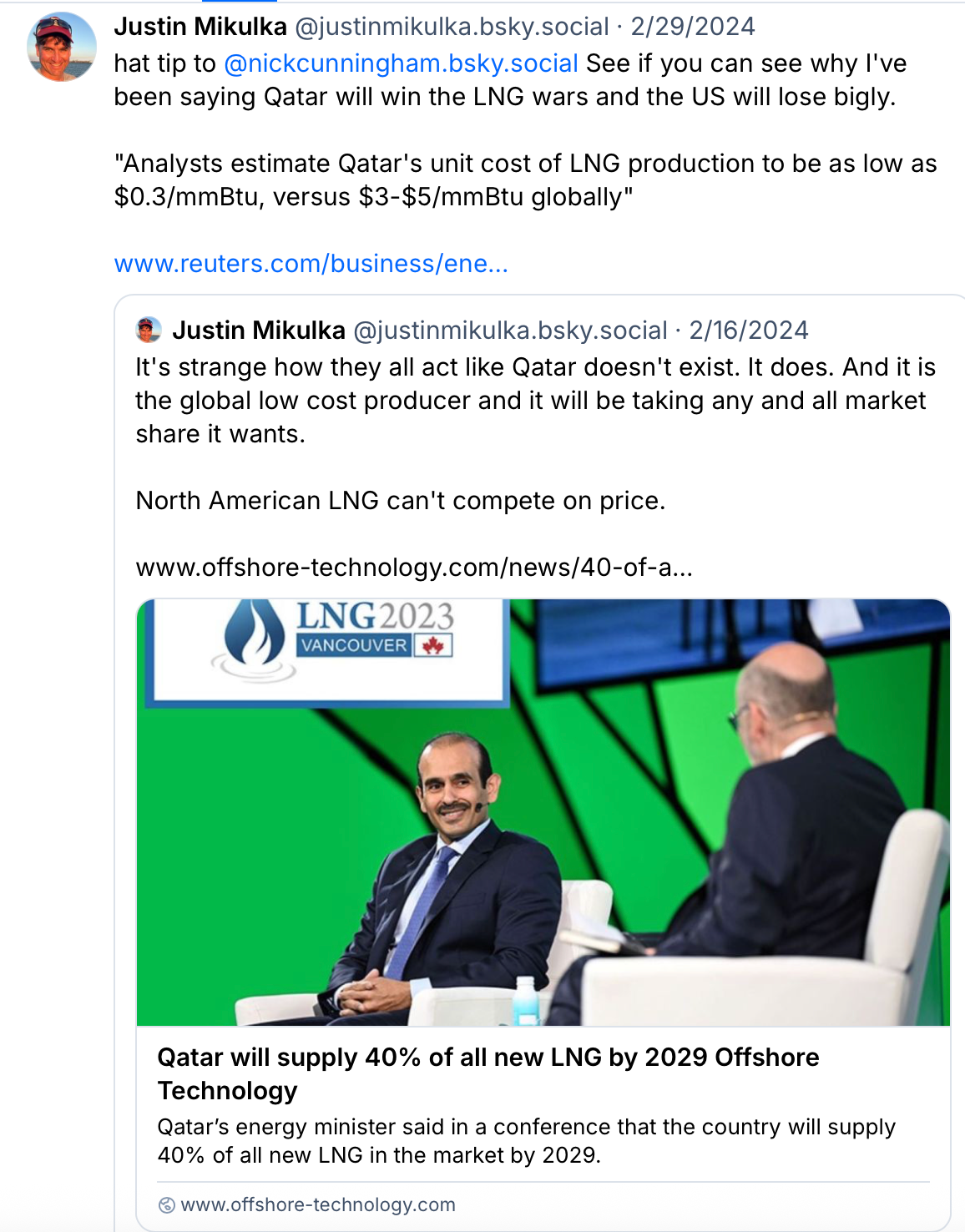 An important point to understand is that U.S. LNG is the highest cost in the world of the major producers and Qatar is the lowest. Can Qatar survive in a world of $7-$8 LNG? They can probably do ok. Can the US exporters? No.