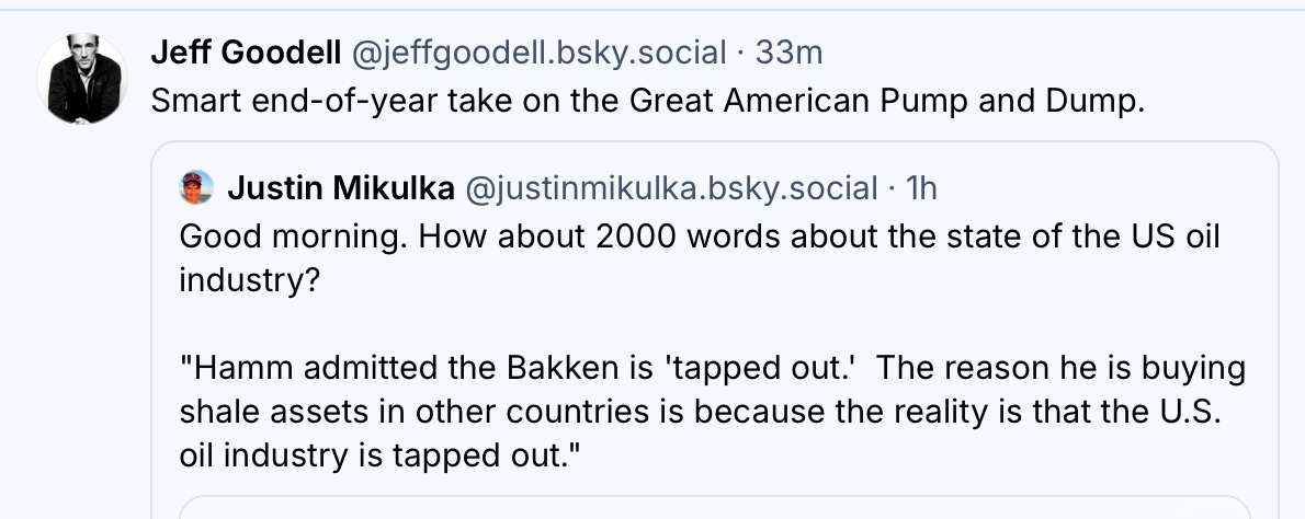 But I learned another interesting fact from that discussion. This person had learned about my work from an Oklahoma oil banker. They were talking to this banker and said, “There is a lot of fraud in the reserves estimates” and the banker reportedly said, “yeah, you should read this guy Mikulka.” Remember, my work was only published on a little-known climate focused website. And an oil banker in Oklahoma had read it and it apparently made an impression. Around that time I was contacted by someone else who told me my work was having an impact with "money people." This was nice to hear but I explained it wasn’t sustainable and I needed to make a living wage. Some attempts were made to fund a fellowship for my work. Nothing came of it. Eventually I gave up on the idea of making a living doing this work and I went to work for a think tank to research industrial decarbonization and got paid a fair wage (with benefits!) to do what I do well. While there I suggested that I write something on the energy markets each week. The latest news with a bit of analysis. No one was interested. When I was hired I was told there was two years of funding and after that two years I found out there was no more and moved on.