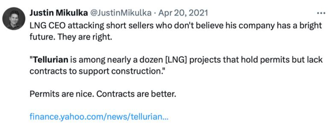 In 2019, when I first explained how the current scenario was a highly likely outcome, it was a great time to be an LNG CEO. Charif Souki was an LNG CEO then and a media darling and appeared on Mad Money with Jim Cramer talking big about the U.S. LNG industry and touting his new company Tellurian. I was never a believer and pointed out in 2021 that his company was in trouble when short sellers took notice of his company’s problems and in response Souki mocked them.