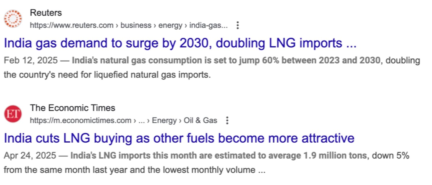 In March I wrote a piece in response to the optimistic outlooks for India LNG demand that explains why it was highly unlikely India would double its LNG imports by 2030. With only a month left in 2025, it is a safe bet that India will import less LNG than it did in 2024. Meanwhile, none of the facts you just read are mentioned in the slick new video from Shell on why LNG has such a bright future in India. In the video they also do not address the question raised by Gas Outlook, “Where will all the new LNG go?” or why anyone would pay for expensive LNG when there are other more attractive fuels. The oil and gas industry has a long history of using slick video marketing to mislead people. It’s not surprising they would try this bit of deception again. However, it’s a lot easier to lie to people about science and climate change than it is to lie to them about the price of energy (see: Trump and his ilk lying to Americans about inflation and the price of gas and Americans not buying it).